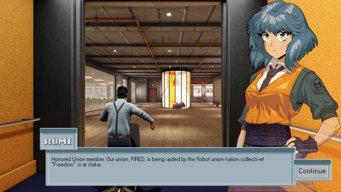 Мы выкатываемся из лифта в офисные помещения с миниганом наперевес, где некая аниме-тян Руми инструктирует нас. По её словам нашу родную и столь любимую корпорацию захватили злые роботы и именно нам выпадает честь разнести их всех на мелкие платы. Собственно этим мы и будем заниматься на протяжении 12 минут. Именно столько нужно продержаться, чтобы завершить уровень.