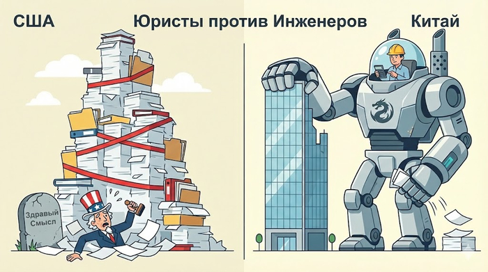 США — это страна, парализованная «ветократией». Это система, где любой прогресс вязнет в болоте судебных исков, общественных слушаний и бесконечных согласований. Америкой правят юристы, чья главная компетенция — умение красиво спорить и затягивать процессы.