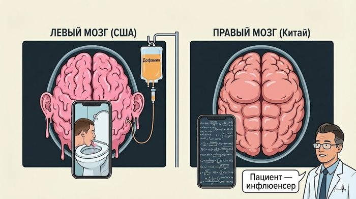 В Китае версия TikTok (Douyin) для детей жестко модерируется. Там нет треш-стримов. Там наука, история, патриотизм и спорт. Лимит — 40 минут. В США и Европе алгоритмы настроены на максимальное удержание внимания любой ценой. Итог: деградация концентрации, эпидемия СДВГ и мечты стать блогером.