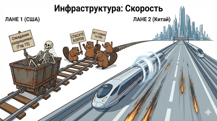 Вот где разрыв между цивилизациями становится пропастью. Взгляните на Калифорнию. Проект скоростной железной дороги (High-Speed Rail) мучают уже 15 лет. Потрачены миллиарды, построено ноль целых, ноль десятых. Почему? Экологи судятся за миграцию редких тушканчиков, землевладельцы судятся за вид из окна, профсоюзы требуют нереальных условий. Бюрократия пожирает бюджет быстрее, чем работает экскаватор.