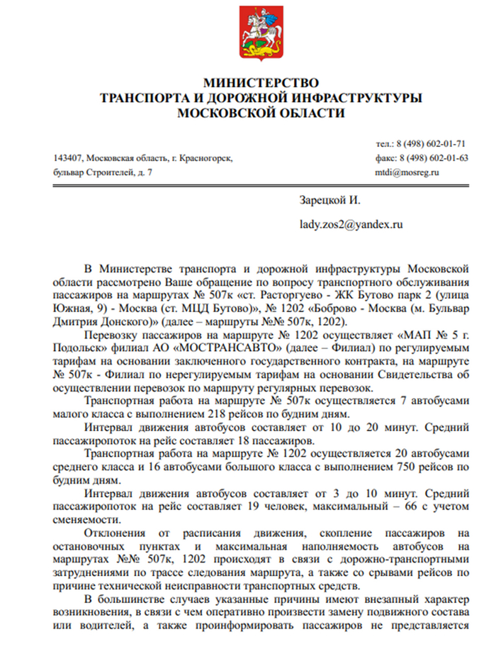 Чтобы разобраться в ситуации, касающейся условий труда машинистов и функционирования транспорта, мы направили запрос в Министерство транспорта и дорожной инфраструктуры Московской области. Информацию о перевозчиках, обслуживающих маршруты № 507К «ст. Расторгуево - ЖК Бутово парк 2 (улица Южная, 9) - Москва (ст. МЦД Бутово)» и № 1202 «Боброво - Москва (м. Бульвар - Дмитрия Донского)», мы получили 18 декабря 2024 года. Согласно документу, на маршруте № 1202 перевозки осуществляются компанией «МАП № 5 г. Подольск» по регулируемым тарифам на основании заключенного государственного контракта. В то же время на маршруте № 507к задействован филиал, работающий по нерегулируемым тарифам в соответствии со свидетельством об осуществлении регулярных перевозок. На маршруте №507К задействовано 7 автобусов малого класса, которые выполняют 218 рейсов в будние дни с интервалом движения от 10 до 20 минут. Средняя загрузка автобусов составляет 18 пассажиров на рейс. А на маршруте №1202 используются 20 автобусов среднего класса и 16 большого, осуществляющих 750 рейсов в будние дни. Его интервал движения варьируется от 3 до 10 минут, а средняя загруженность рейсов составляет 19 пассажиров, при этом максимальный пассажиропоток достигает 66 человек с учетом сменяемости.