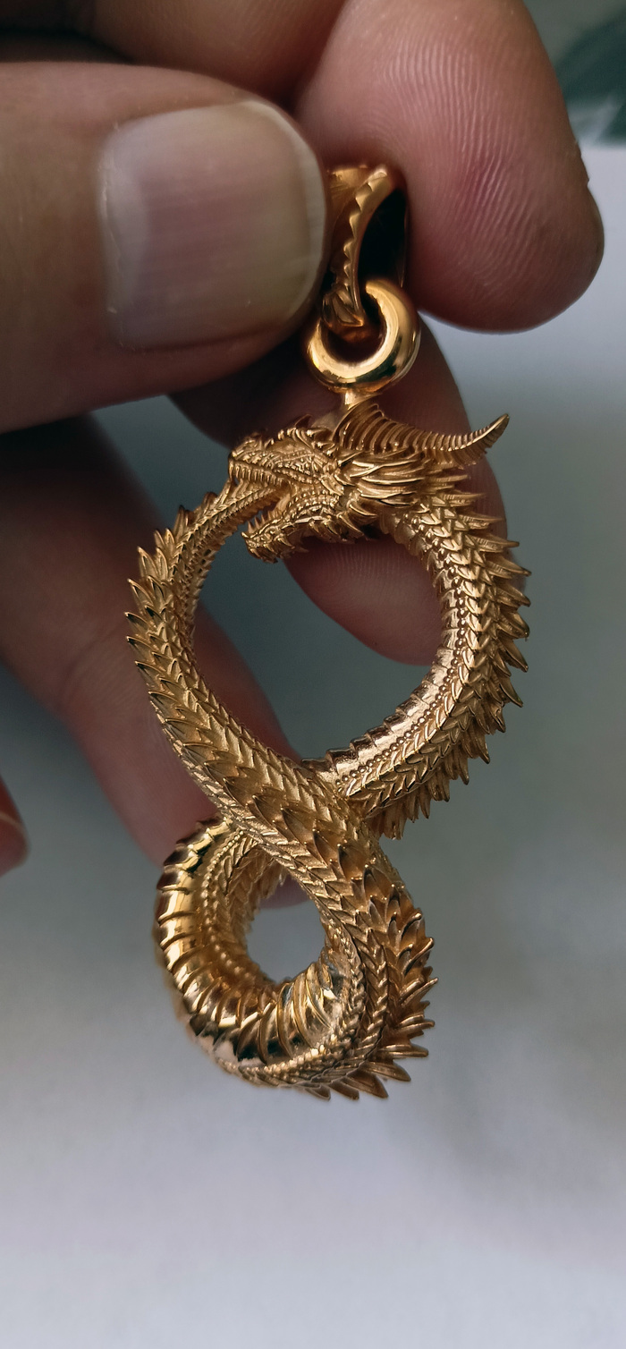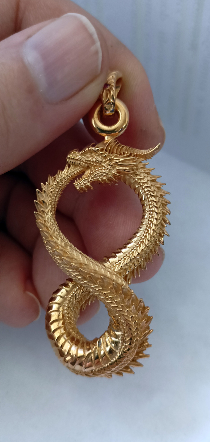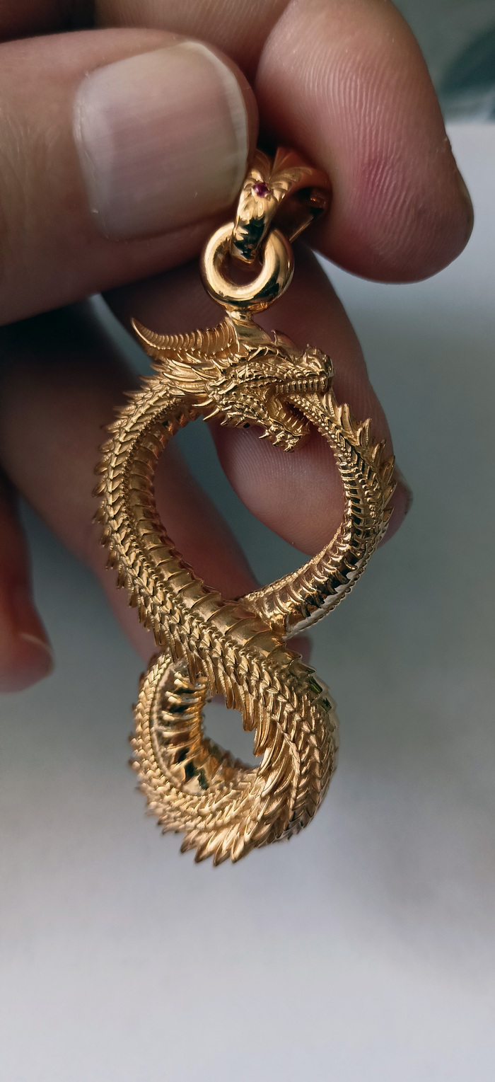 Здравствуйте . Закончил очередной проект . Кулон Дракон Уроборос по мотивам сериала "Видоизменённый углерод" (Altered Carbon) в размере 5 см без учёта ушка . Кулон полностью объемный . Материал серебро 950 проба . Покрытие золотом 999 пробы . Фото и Видео .