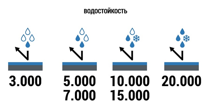 Водонепроницаемость. PU (Полиуретановое покрытие) — обозначение покрытия, которое увеличивает водонепроницаемость материала. HH (Hydrostatic Head) — указывает на водонепроницаемость материала, измеряемую в миллиметрах водяного столба (например, 2000 мм HH означает, что материал выдерживает давление 2000 мм воды);