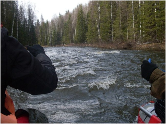 Едем. Катамаран 6-ка, нас семеро, на моем борту четверо гребцов друг за другом. Периодически от непривычной тесноты цепляемся друг за друга веслами при гребле. Я была на Вижае в первый свой сплав, но запомнила его как спокойную речку. В этот же раз почти сразу все началось с валов на реке и постоянного маневрирования между расческами и иногда между камнями. Николай Палыч констатировал, что это классическая двойка. Но в первые полчаса все интересное закончилось, дальше – почти спокойная и быстрая вода и Вижай становится шире. Уровни спали минимум на метр от максимальных этой весной.