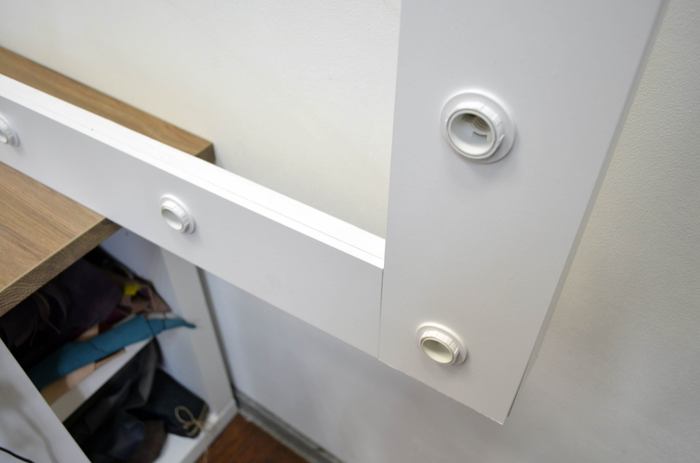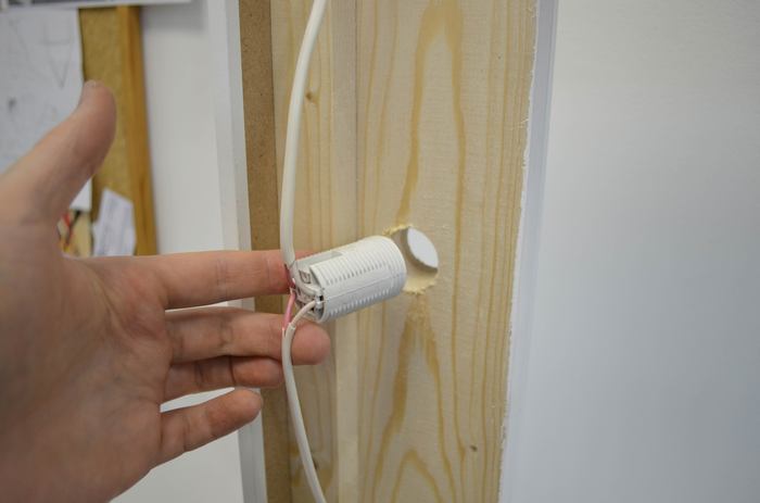 Этап пятый. Проводка. Последовательно соединяем патроны между собой. И выводим шнур питания с выключателем с любой стороны. Также делаем крепежи на стену на рисунке внизу хорошо видна конструкция. Это уголки, брусок и все на клей ПВА