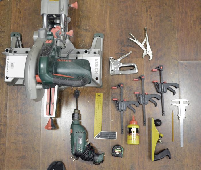 Относительно инструмента. Я использовал эту шайтан-машину. Позволяет идеально распилить без сколов и лохматостей, а также выставить градус. Благодаря лазерной метки распил происходить очень точно. Всё остальное обычное угольники, рулетки, саморезы уголки и прочее. Самое главное это такая машина и хороший клей.