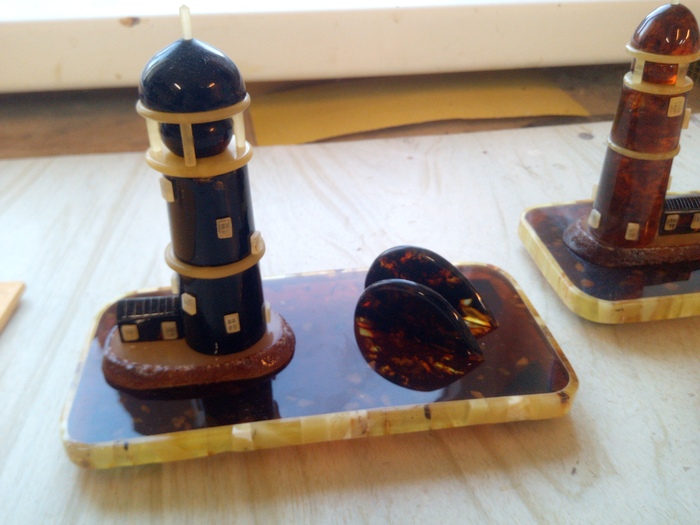 2 маяка состоящих из "пресса". Подставка "янтарная заливка", обрамленная чистым янтарём.