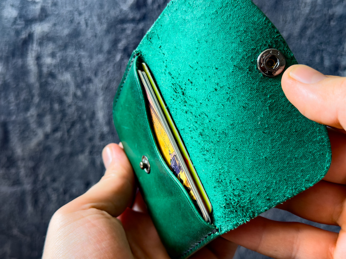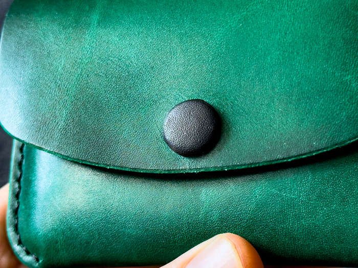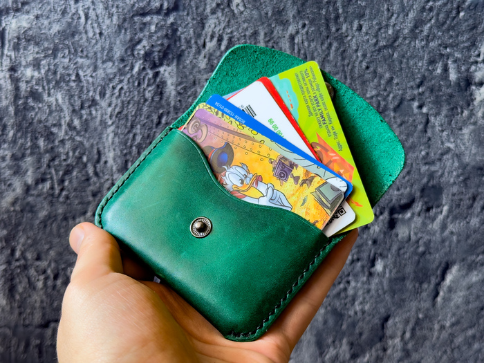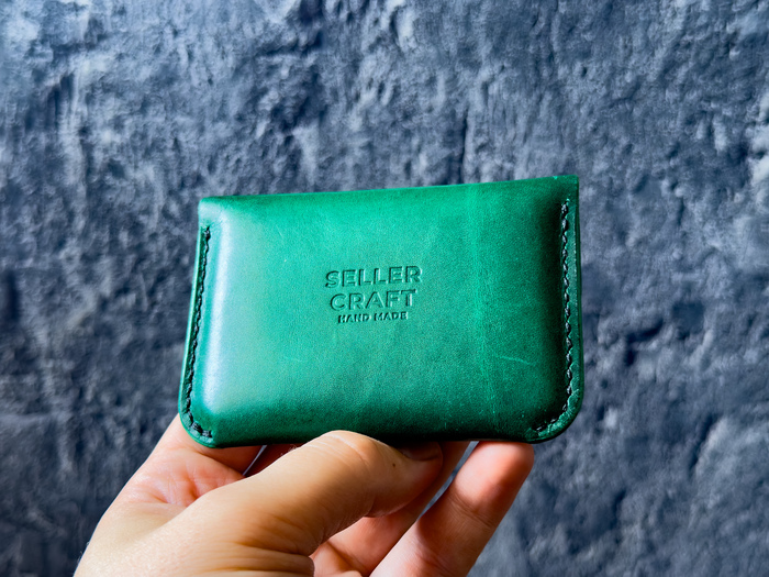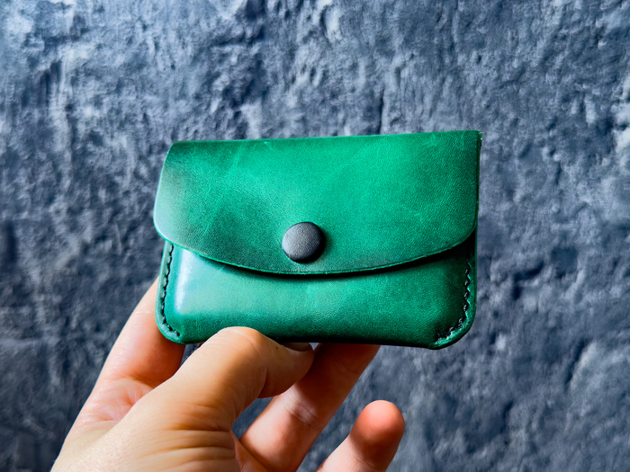 На фото: визитница ручной работы, натуральная кожа, цвет «Изумруд». Кожаная кнопка — чтобы было тихо и солидно.
