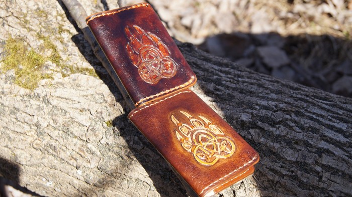 Визитницу сделала из кожи растительного дубления. Оттиснила рисунок, долго, немного запуталась, но вроде исправила и получилось правильно. Затем покрасила профессиональными красками для кожи fiebing's. Покрыла затем Итальянским финишем для закрепления и пошла фотосессию делать)