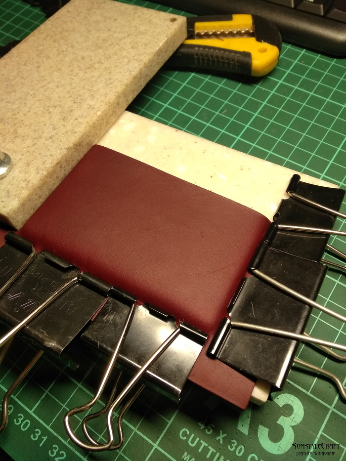 Вот такие получились кармашки. За «форму» брал стопку из пяти пластиковых карт, а для прижима использовал канцелярские зажимы — что было под рукой.