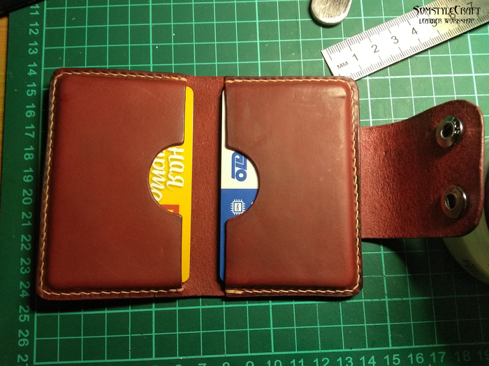 Заметна небольшая ошибка с выкройкой — карманы надо будет сместить вниз на 5 мм, так как в верхний карман карта входит не полностью, но вполне помещается стандартная визитка.