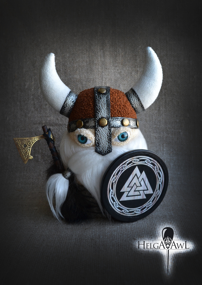 Ткань служит ему кожей, пластиковые глаза его не знают сна и сияют мужеством, тело греет шерстяная рубаха и меховая накидка. Венчает голову шлем, декорированный искусственной кожей с имитацией металла и металлической фурнитурой.