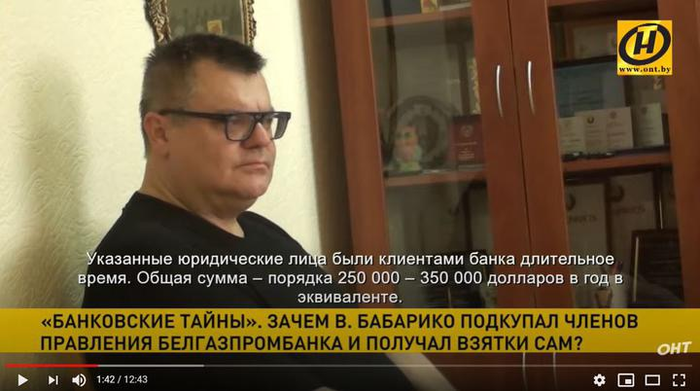 13 июля, в разгар избирательной кампании, телеканал ОНТ выпускает «разоблачительный сюжет» под названием «Чёрная касса Белгазпромбанка». Замначальника управления ДФР Дмитрий Дягилев рассказывает, что «Бабарико и топ-менеджеры банка получали „грязные деньги“ преступным путем» и что покупка облигаций Белгазпромбанка на предъявителя позволяла «незаконные доходы руководства банка сделать чистыми». Старший инспектор КГК Артем Дунько в интервью БТ заявляет, что «преступная деятельность осуществлялась под непосредственным руководством бывшего руководителя банка Бабарико и иных лиц».
