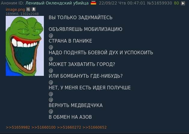 3) Про все эти аргументы «их обменяли на наших ребят». «Жизни наших бойцов бесценны». «Обменяли на того кого надо». А жизни людей, которые погибли, пока тех же азовцев брали, вам что, насрано? А почему по такому курсу? А у нас отсутствует обменный фонд? А почему не показывают и не освещают обмены? При том, что противник откровенно по поводу этих обменов глумится в инфополе, и они пиздец как деморализуют наше население, создавая ощущение предательства?