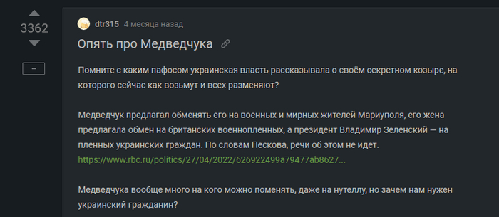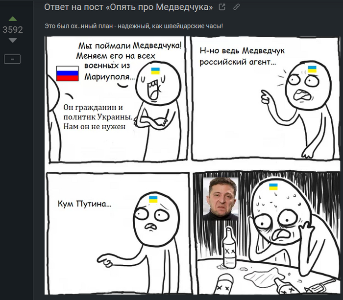 Обмен своих пленных - хорошо, особенно если его грамотно подать в информационном поле. Обмен Виктора сука Медведчука - лютый пиздец, который уже изо всех сил использует украинская сторона.