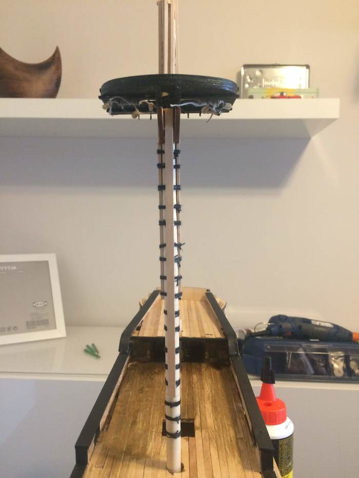 Последние детали на палубе установлены. Начинается крепление мачт. Для соединения канатов использовал обкусанные скрепки, чтобы сохранить транспортируемость этой бандуры. В любой момент вынимаем их и мачты вытаскиваются. Высота её около метра. И длинна примерно такая же.