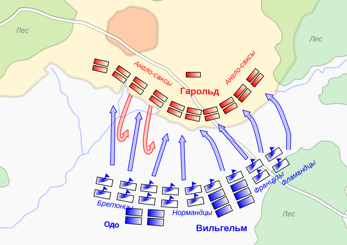 За лучниками в атаку пошла пехота. Однако, и эта атака была отбита, так как в битве пехоты против пехоты преимущество обычно у тех, кто в лучшей позиции, а в лучшей позиции были англичане. Следующую атаку, на этот раз конную, англичане, вроде как, тоже отбили и даже обратили часть войска Вильгельма в бегство, однако тут произошел переломный момент, включающий в себя некое “ложное отступление”, который источники описывают по-разному.