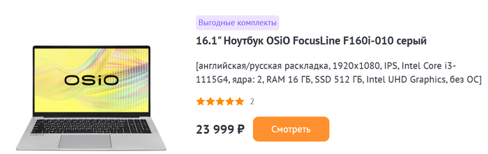 Для тех, кому экран с диагональю 14 дюймов покажется маленьким, альтернативой может стать OSiO FocusLine F160i-001. При сравнимой стоимости, этот ноутбук имеет немного более медленный процессор Core i3-1115G4 и аналогичный объем ОЗУ, зато оснащен крупным 16,1-дюймовым экраном с разрешением Full HD и SSD-накопителем на 512 ГБ.