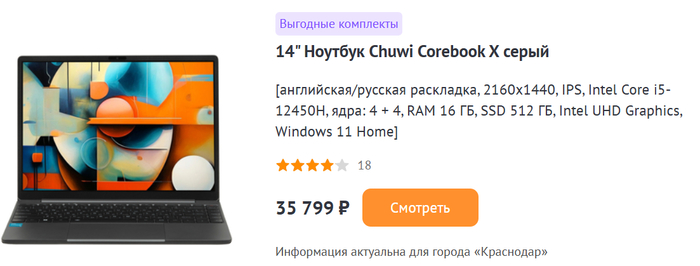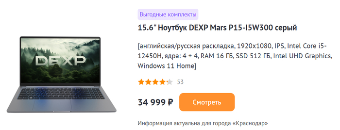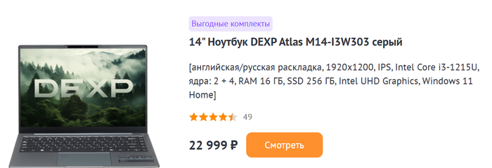 Среди ноутбуков стоит присмотреться к DEXP Mars P15-I5W300 за 35 000 рублей. Эта модель основана на быстром процессоре Core i5-12450H, у которого четыре производительных и четыре энергоэффективных ядра. Дополняет картину 15,6-дюймовый IPS-экран с разрешением Full HD, SSD-накопитель на 512 ГБ и 16 ГБ ОЗУ: с такими параметрами апгрейд понадобится нескоро.