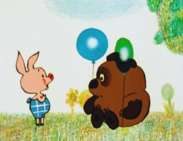 Кстати, во второй и третьей сериях рисунки героев были упрощены: черные «очки» на мордочке Винни-Пуха приобрели четкие очертания, а румяные щечки Пятачка стали обозначаться одной красной линией.
