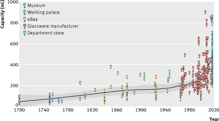 Интересное исследование провели Кембриджские ученые. Они сравнили бокалы из хранилищ музеев с современными, проверив 411 бокалов. В 1700 году в британских тавернах вино разливали в рюмки объемом всего 66 мл. С тех времен бокалы увеличились объемом до 450 мл, причем 150 мл они прибавили за последние 17 лет. Так же резко в Британии выросло и потребление спиртных напитков и их крепость.