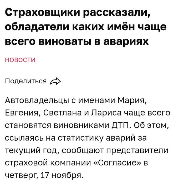 Примерно полгода назад добавилась в телеграмме в группу своего города. Там, естественно, часто постят новости о ДТП. И заметила странную тенденцию - обвинять абсолютно всех, кроме водителей в возрасте 35-45 лет. Объясню: