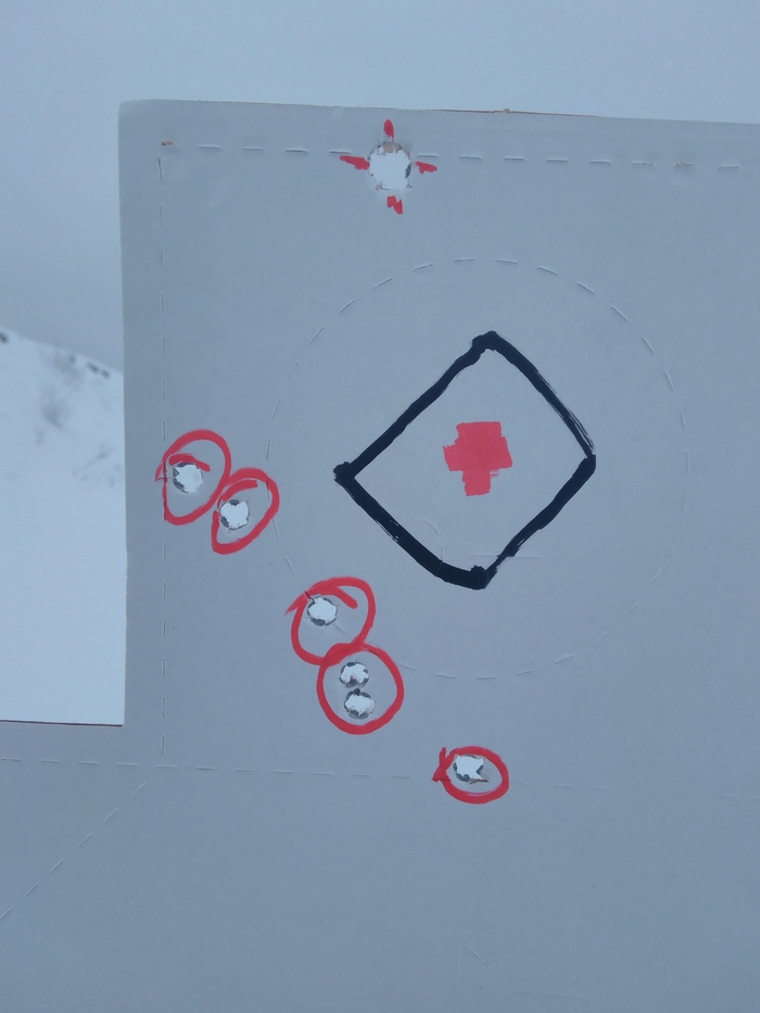 И наконец сегодня, выбрались на стрельбище, пристрелять всю эту красоту. Патроны Барнаул, пуля 9.6 грамма. На 100 метров 2 серии выстрелов по 3 штуки (кружками отмечены). В каждой есть отрыв. Есть к чему ещё стремится. Но кучность удивила, не ожидал такой от почти 80 летней винтовки.