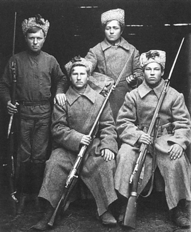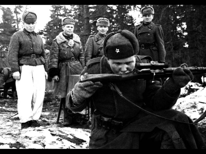 Пехотинцы вооружены советскими винтовками Мосина, легко узнаваемыми по "русскому штыку четырехгранному".