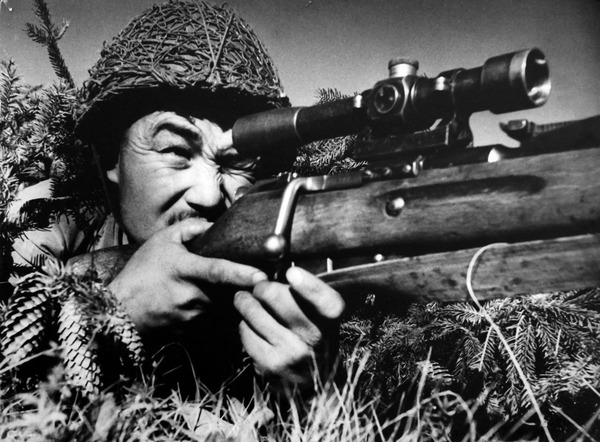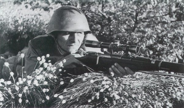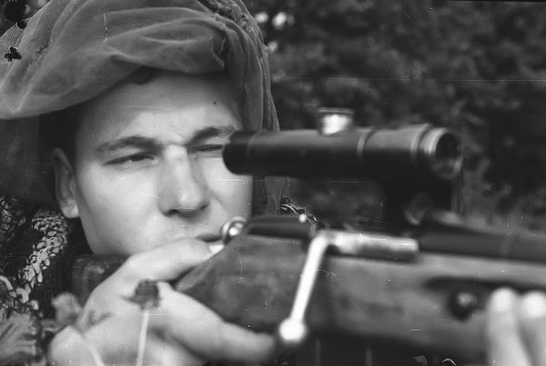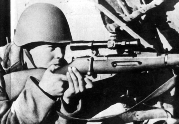Советский снайпер В.А. Сидоров на огневой позиции в августе 1941 года. Красноармеец вооружен снайперской винтовкой Мосина с оптическим прицелом ПЕ образца 1931 года.