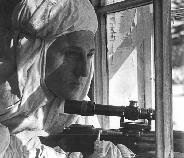 Советский снайпер у окна на Ленинградском фронте, март 1943 г.