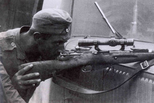 Немецкий солдат смотрит в прицел трофейной советской снайперской винтовки Мосина.