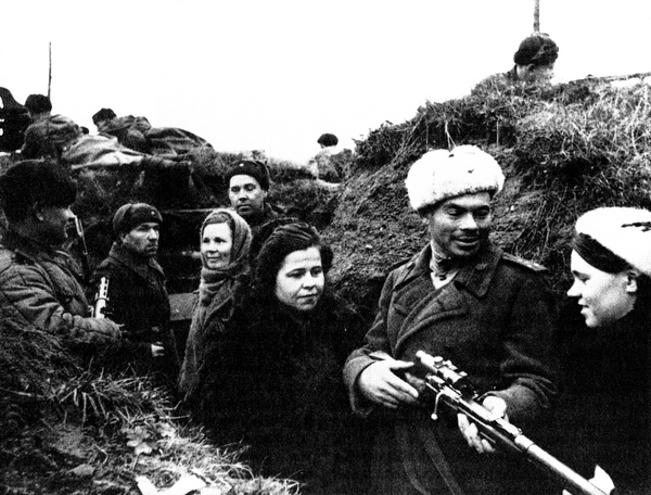 Советский снайпер 8-й гвардейской стрелковой дивизии имени Панфилова Акмат Жумагулов на боевой позиции. Киргиз по национальности. К лету 1943 года уничтожил 101-го солдата и офицера противника.