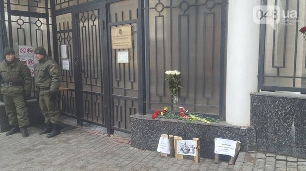 "Деревянные чурки и плакаты, посвященные смерти постпреда Российской Федерации в ООН Виталия Чуркина, одесситы принесли к Генконсульству страны-агрессора.