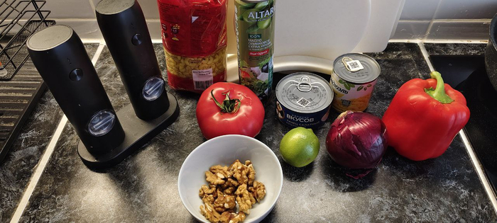 Макароны ( у меня рожки, можно использовать и перья и спиральки), болгарский перец. красный лук, томат, тунец салатный, кукуруза, грецкий орех, оливковое масло, лайм, соль и перец.