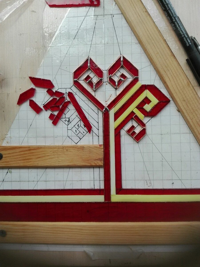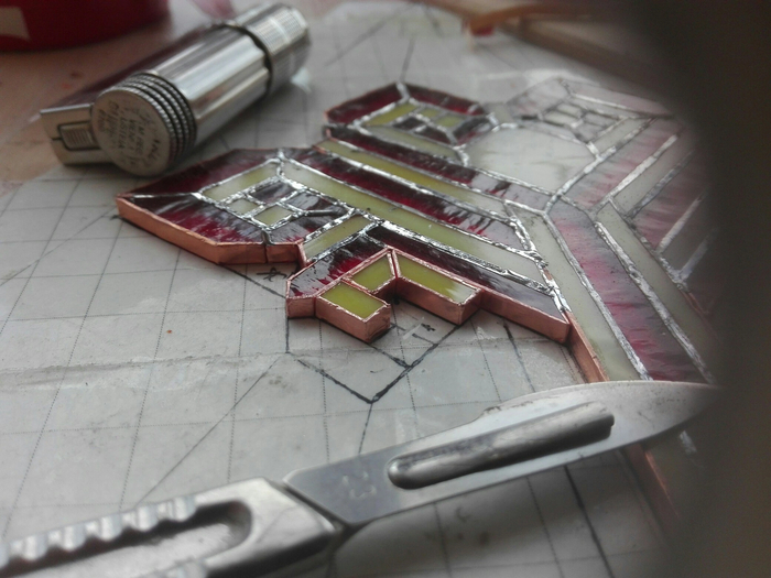 С последней работы я немного наловчился в резке стекла, как я считал, но все оказалось иначе. Все шло более менее нормально, пока не начал вырезать крайнюю правую деталь из синего стекла. Пытался я её вырезать три раза, пока не кончился кусочек стекла, но так и не вышло. Она трескалась по середине. Так и оставил, и порезал левую также. Выводы я сделал такие: резать на поверхности, которая не прогибается, а пробковая доска немного да ходит; ослабить силу нажатия, хоть я думал, что и не сильно жму; угол наклона стеклореза не менять во время резки. Сначала немного расстроился, а потом подумал - на ошибка же учатся, самый ценный опыт.