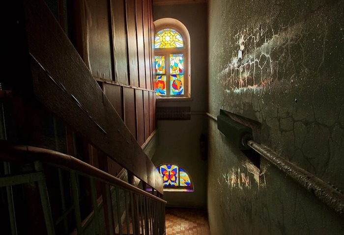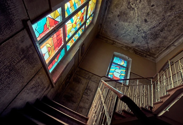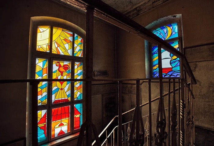 Пыльные и грязные окна — верный признак заброшенного или как минимум необитаемого здания. Всё-таки жизнь и эксплуатация помещения не позволяют допустить состояния, когда окна столь грязные, что за ними почти не видно витражей...