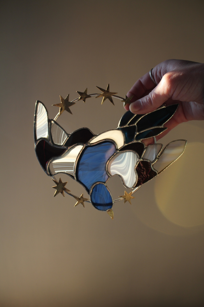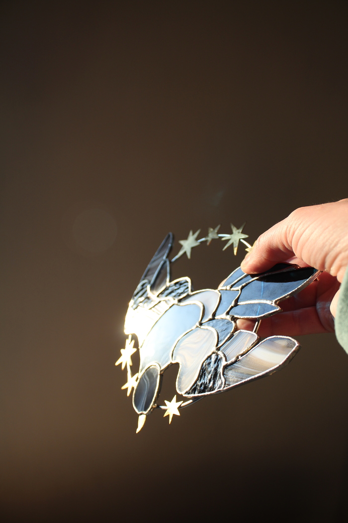 Для создания брошки использовались: витражное стекло, витражные краски и оловянно-медный припой.