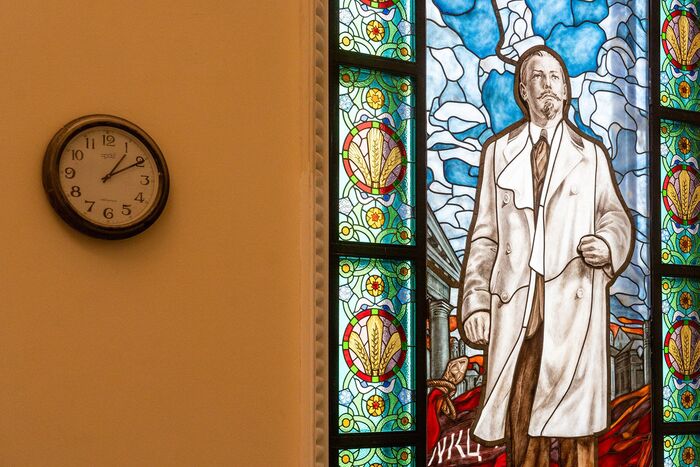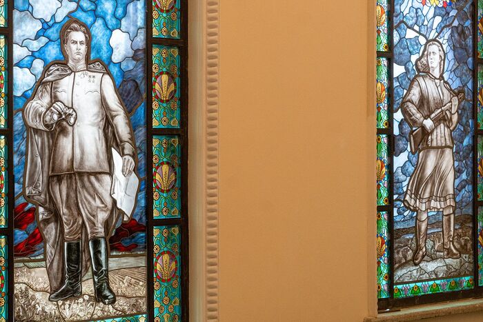 Витражи создавали заново по архивным фотографиям и кадрам документального фильма. Все стеклянные элементы обжигали при температуре 630 градусов до 8-10 раз.