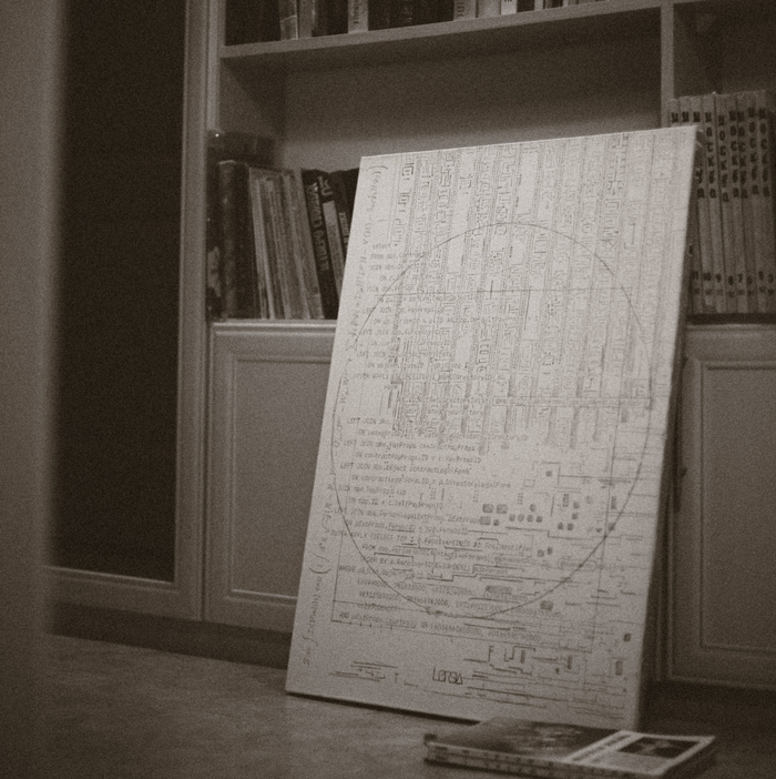 На этот раз мой заказчик - талантливый программист и увлеченный своей работой человек. Я всегда искренне радуюсь возможности взаимодействовать с такими людьми. Он прошел огромный путь в своей карьере, достиг серьезных результатов. И порой, оглядываясь назад, в обрывках памяти теперь всё это выглядит не просто как список из закрытых задач, а именно как реминисценция о бессонных ночах, титаническом интеллектуальном труде и километрах написанного кода, над которым он так усердно работал (и ведь не зря). Узнав, что я пишу картины на инженерную тематику, у него возникло желание запечатлеть одно из своих достижений через искусство, маслом на холсте. Мне нельзя знать и спрашивать о чем именно этот фрагмент (вы можете попробовать разгадать сами), но как говорит он сам: