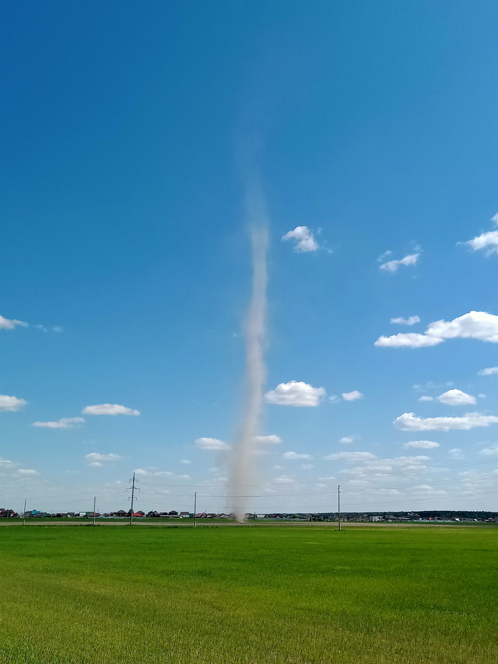 Сразу скажу что в Тюмени торнадо не бывает, условия не не те. Хотя вихрь, он и в Сибири вихрь. Хорошо что ему не хватило энергии перерасти во что-то серьезное. Высота по моим прикидкам метров 200. Хотя я могу и ошибаться. Разрушился вихрь спустя минуты три после возникновения столкнувшись с опорой ЛЭП.