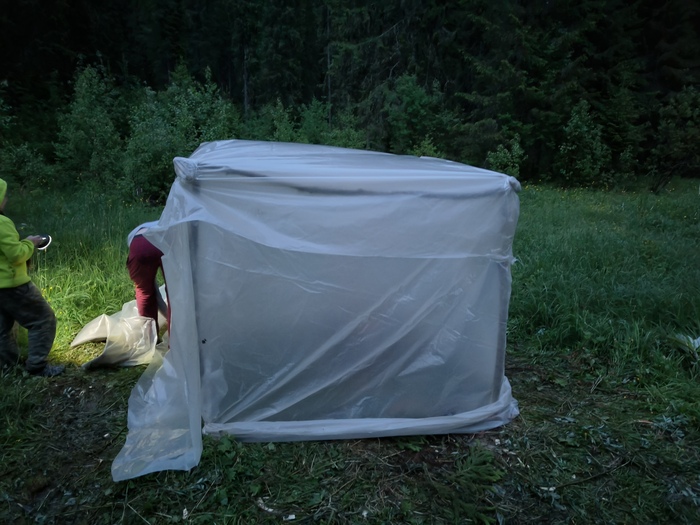 Как следует прожарив камни, стены закрыли полиэтиленовой пленкой, нагрели воды на костре, и ближе к полуночи баня была готова.