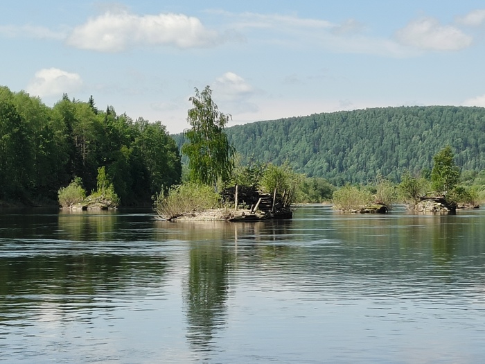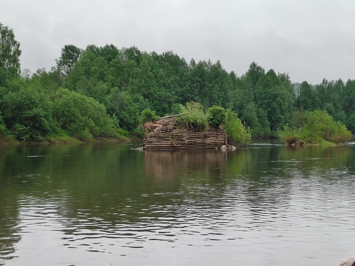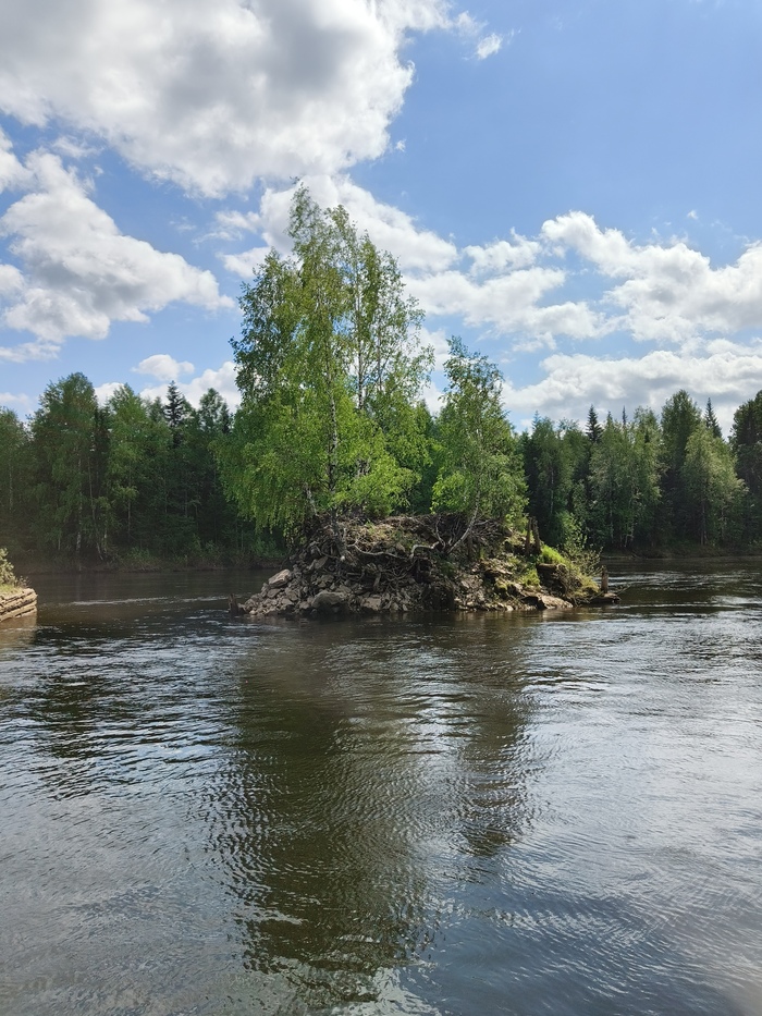 Осмотрев церковь, мы отправились дальше. Движение на реке стало довольно живым, то и дело обгоняли друг друга многочисленные катамараны наших соседей по стоянкам у камня. На перекатах я пытался поймать кого-нибудь на слепня, но безуспешно. Вскоре начались построенные заключенными острова на середине русла. В те времена, когда по реке активно сплавляли лес, эти острова служили разделительной полосой, чтобы оставалась возможность проходить вверх по реке среди многочисленных бревен. Острова в основном имеют бревенчатый наружный каркас, внутри заполненный камнями и землей. Иногда на них растут деревья.