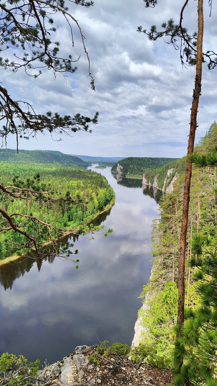 Наверху нам открылись потрясающие виды. Река была как на ладони, местами сквозь прозрачную воду было видно дно, кое-где рябь от ветерка, вдали виднелся остров.