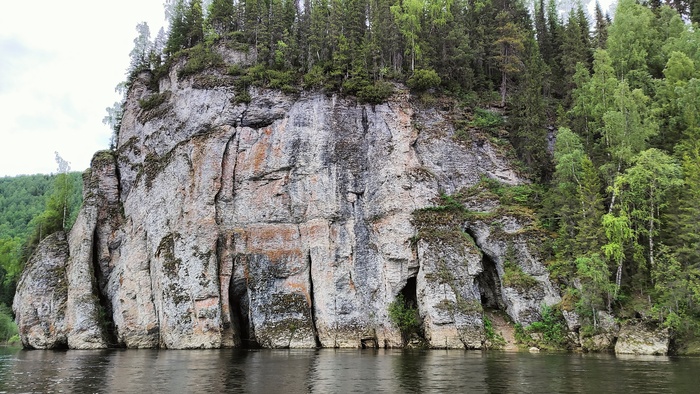 Насладившись им, мы решили посмотреть куда нас приведет уходящая дальше по камню тропа, но, так как время поджимало, договорились далеко не уходить. Легконогие Светлана с дядей Женей убежали вперед, а мы с семьей потихоньку преодолевали подъемы и завалы. Выйдя на следующую вершину, мы поняли, что дальше нам идти нет смысла и попытались докричаться наших попутчиков. Но в лесу звук глушился очень сильно и буквально за 50 метров ничего уже не было слышно. Зато на стоянке внизу нас, как оказалось, слышали вполне неплохо. Вскоре наши спутники появились, так и не найдя пещеру, на которую рассчитывали, и мы отправились в обратный путь. В лагере мы позавтракали, загрузились на наше плавсредство и поплыли любоваться красотами камня снизу.