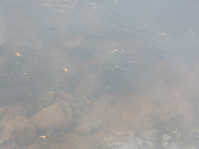 На обед мы встали около дороги, где очень кстати оказалась вместительная беседка со столом. На этом месте на дне реки росла береговая травка с цветочками, которые прекрасно себя чувствовали в водной стихии.