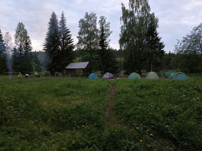Едва мы поставили палатки и тент, пошел обещанный дождь, но продолжался он недолго. Поужинав, мы разбежались от нещадно пожиравших нас комаров и слепней по палаткам, но заснуть из-за близости к жилью оказалось не так-то просто. Кто-то вдали долго и протяжно выл на полную луну, а окрестные собаки отвечали ему своим лаем. Часа в три ночи собаки пришли к нам и раскидали по всей поляне наш мешок с мусором, а рано утром прилетела ворона и начала громко каркать на проводах, идущих вдоль дороги.