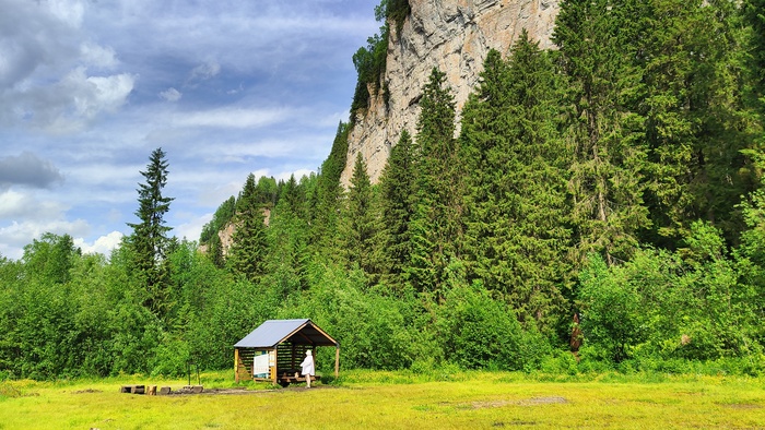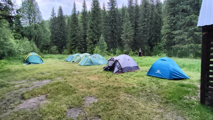 На стоянке была огромная беседка со столом и лавками, столик поменьше и даже деревянный туалет. За ними располагался густой лес.