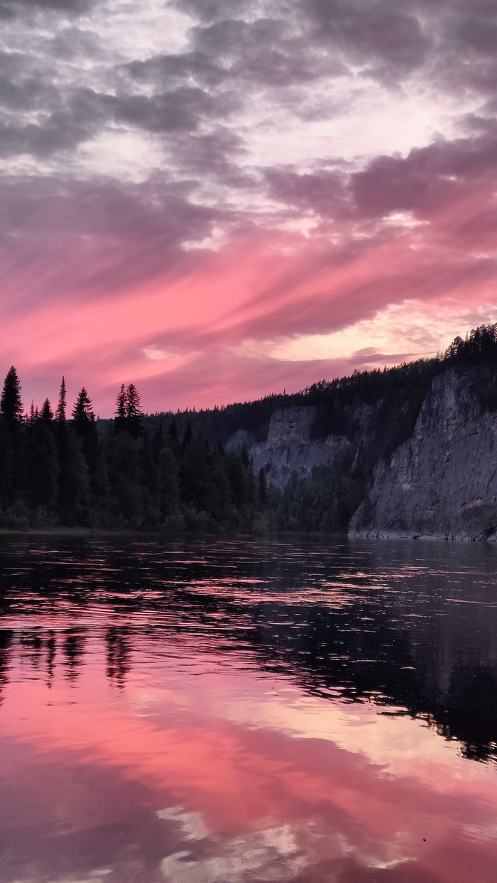 На берегу и на стоянке нам встретились пирамидки обожженных камней, и мы решили сделать походную баньку. Ее постройкой занялись наши Евгении при активной помощи моей дочери, женская часть коллектива занялась приготовлением супа, Алексей вооружился своей бензопилой и топором с целью заготовки дров, а Дамир с Сергеем на маленьком столике принялись разжигать кальян. Начало темнеть, и моей жене удалось поймать кадр с прекрасным закатом над рекой.