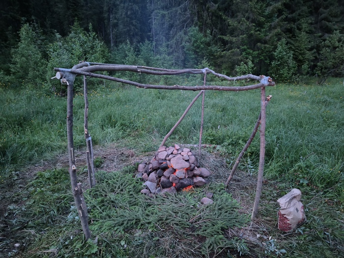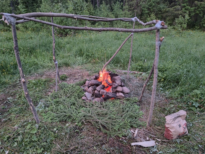 В какой-то момент Скай почуял что-то в лесу и несколько минут беспокойно лаял в ту сторону, но потом успокоился. Для бани была сложенная каменная горка с полостью для костра внутри и поставлены опоры для стен.