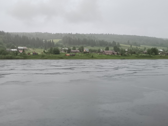 Разжечь костер из мокрых дров было непросто, но мы все же справились и в ход пошли дошираки с сосисками. К концу обеда дождь закапал снова, и мы двинулись дальше. Течение становилось все медленнее, стало больше плесов, но рыба откровенно бастовала. Отчаявшись, я достал поплавочную удочку, насадил на крючок личинку короеда и отпустил поплавок метров на 30 за катамараны, наблюдая за кончиком удилища. Периодически кто-то ей даже интересовался, но привело это лишь к тому, что через пару часов ее съели. В это время мы доплыли до поселка Вишерогорск и отправились в магазин. По дороге на берегу располагалась стоянка старой техники, большая часть из нее уже почти развалилась. На стоянке присутствовал даже большой катер, использовавшийся, видимо, в качестве парома.